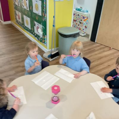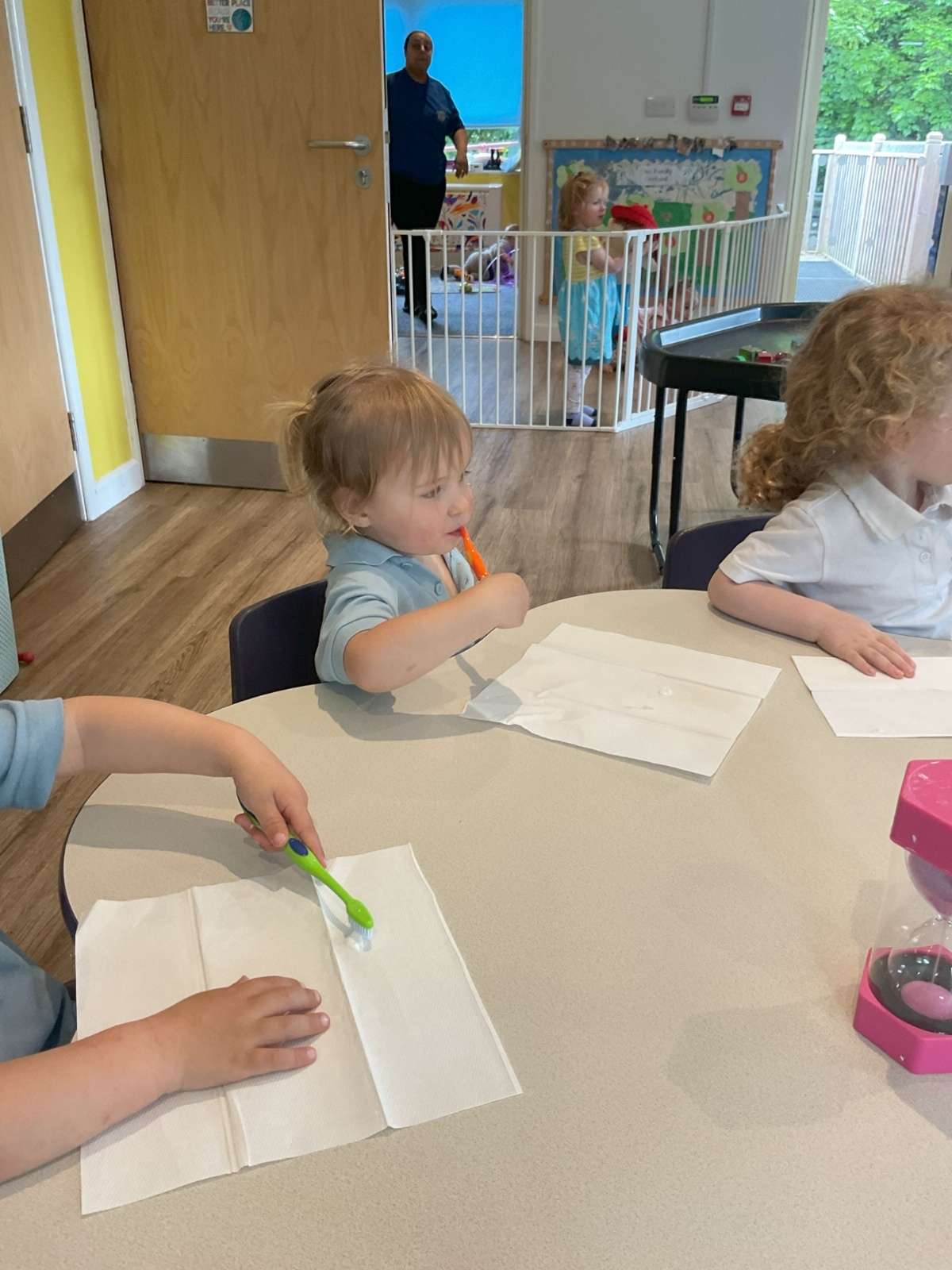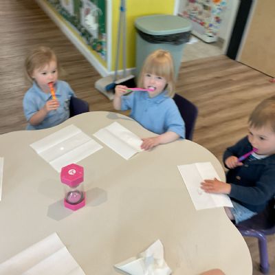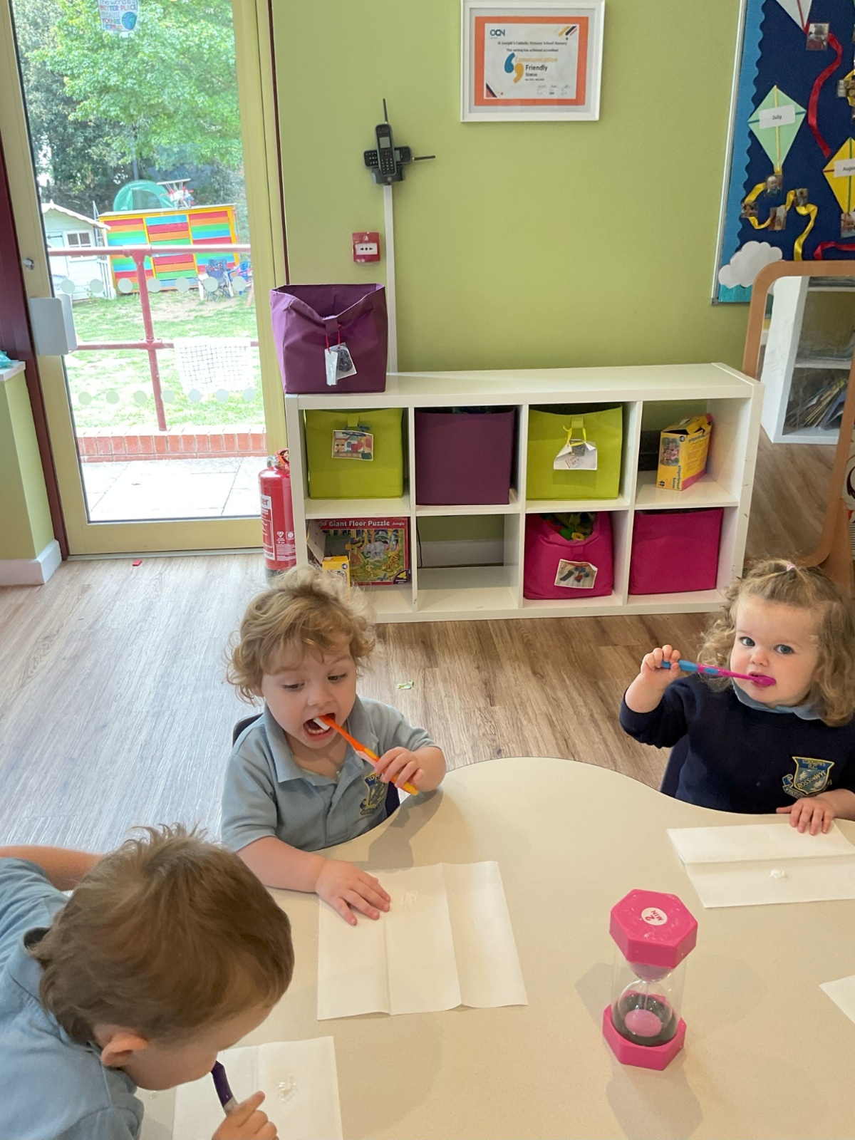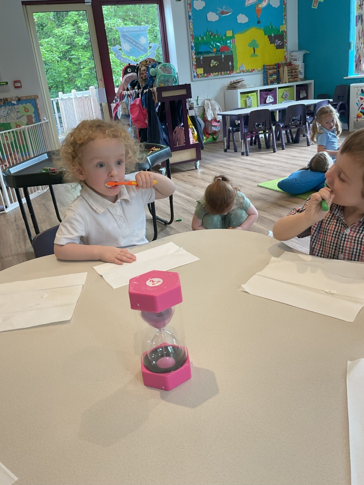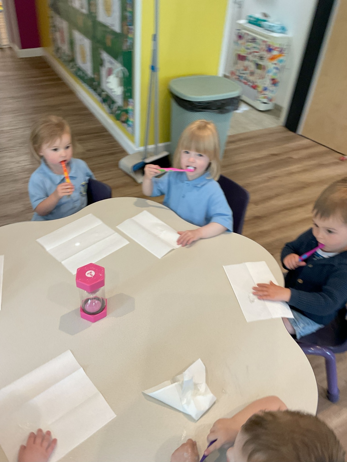We also promote health and self-care, which comes under physical development in birth to 5 matters! One of the ways we do this at St Josephs is by supervised toothbrushing. Children are encouraged to independently brush their teeth after lunchtime. The children absolutely love brushing their teeth while sitting at the table together, watching the sand timer go down.