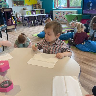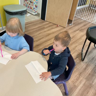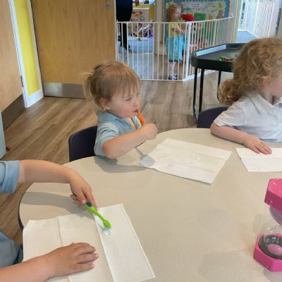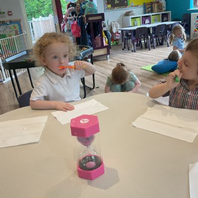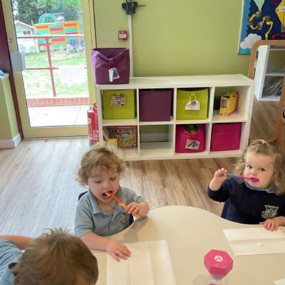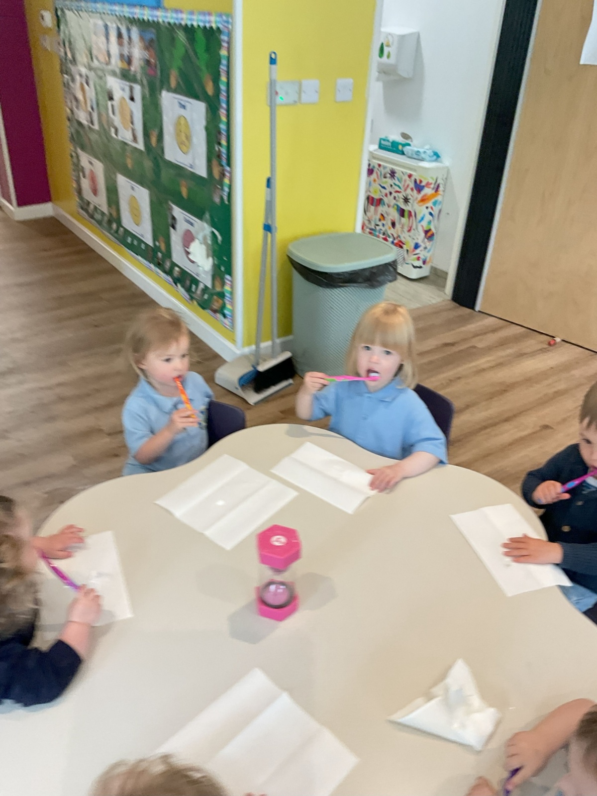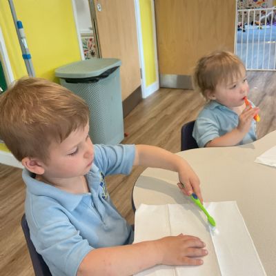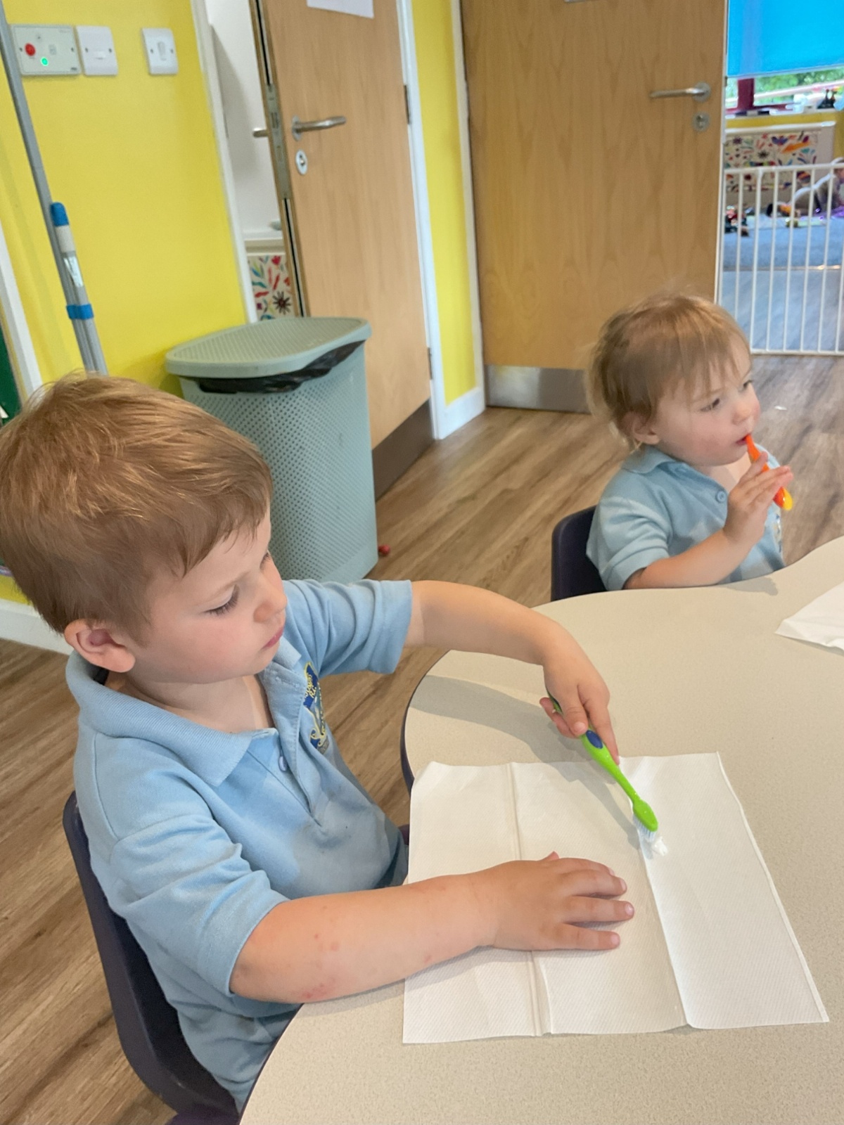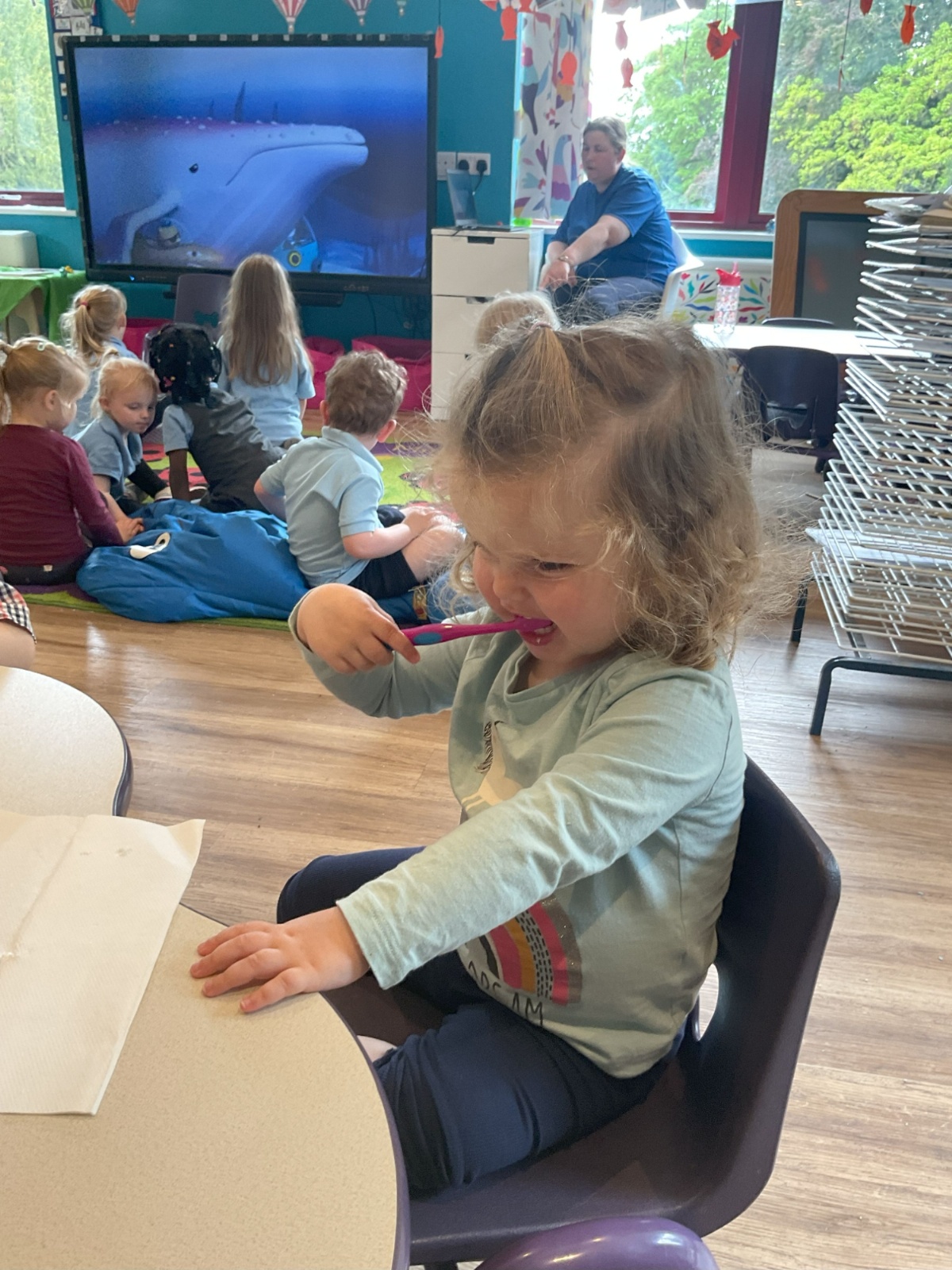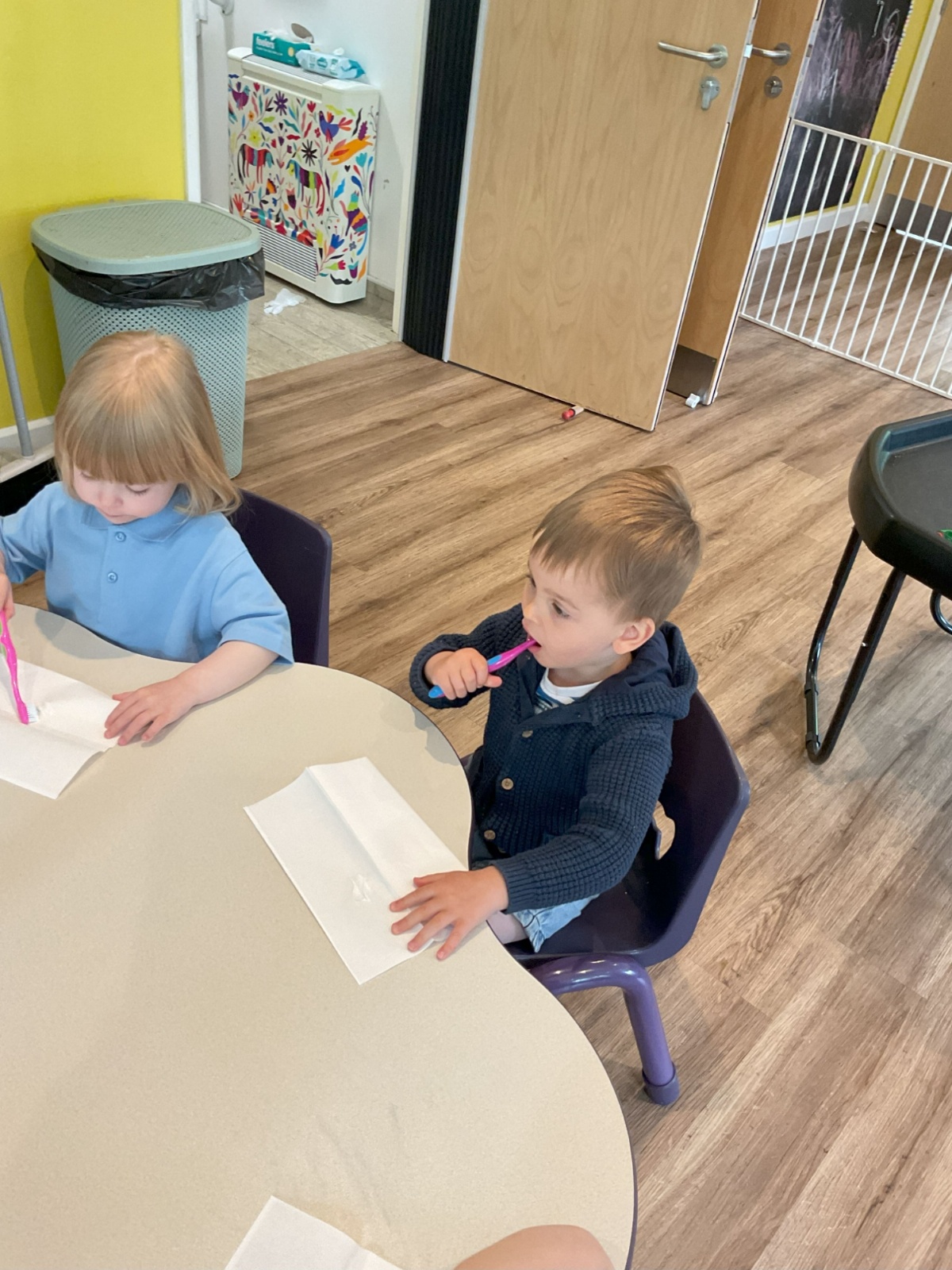 We also promote health and self-care, which comes under physical development in birth to 5 matters! One of the ways we do this at St Josephs is by supervised toothbrushing. Children are encouraged to independently brush their teeth after lunchtime. The children absolutely love brushing their teeth while sitting at the table together, watching the sand timer go down.