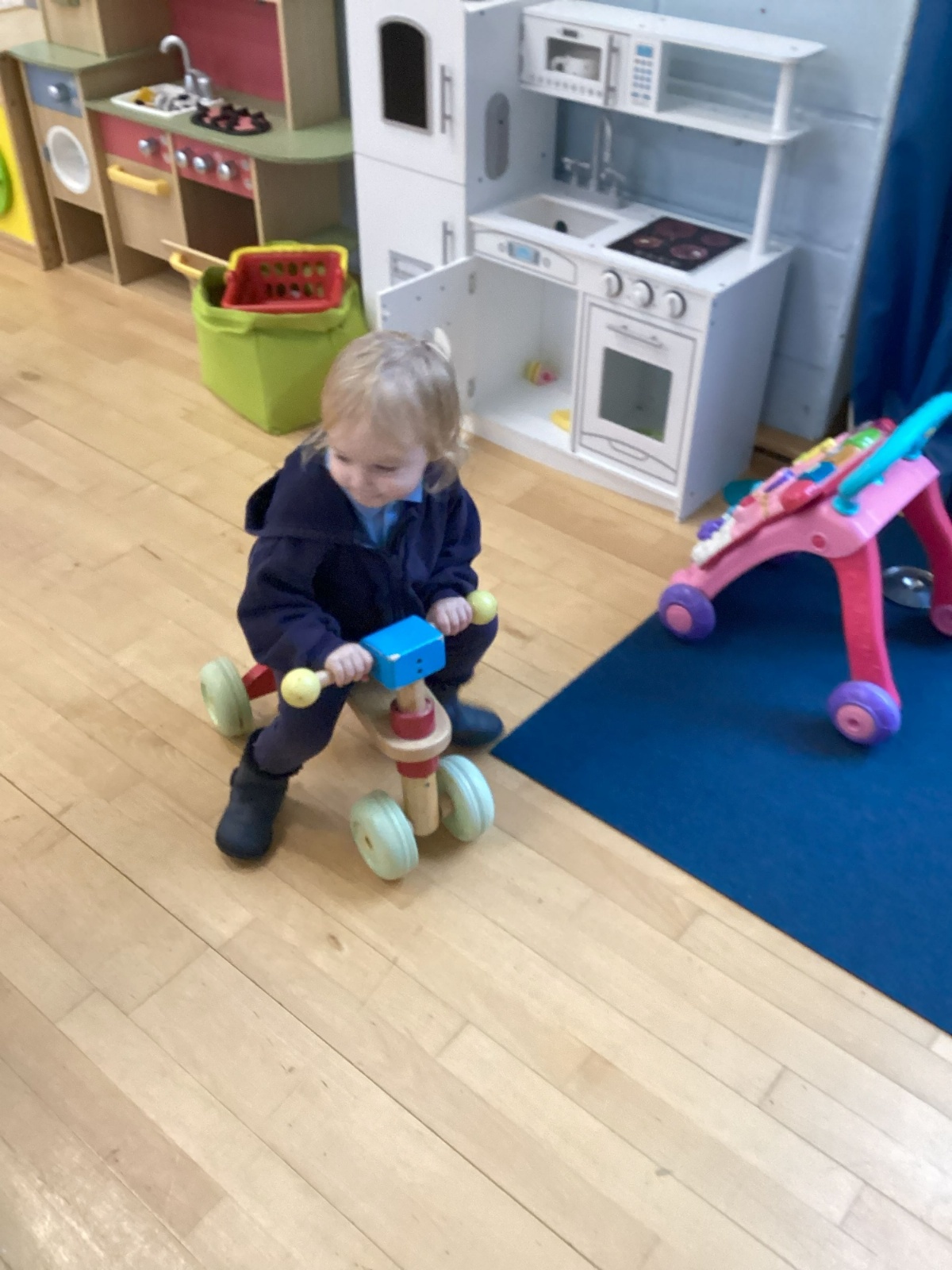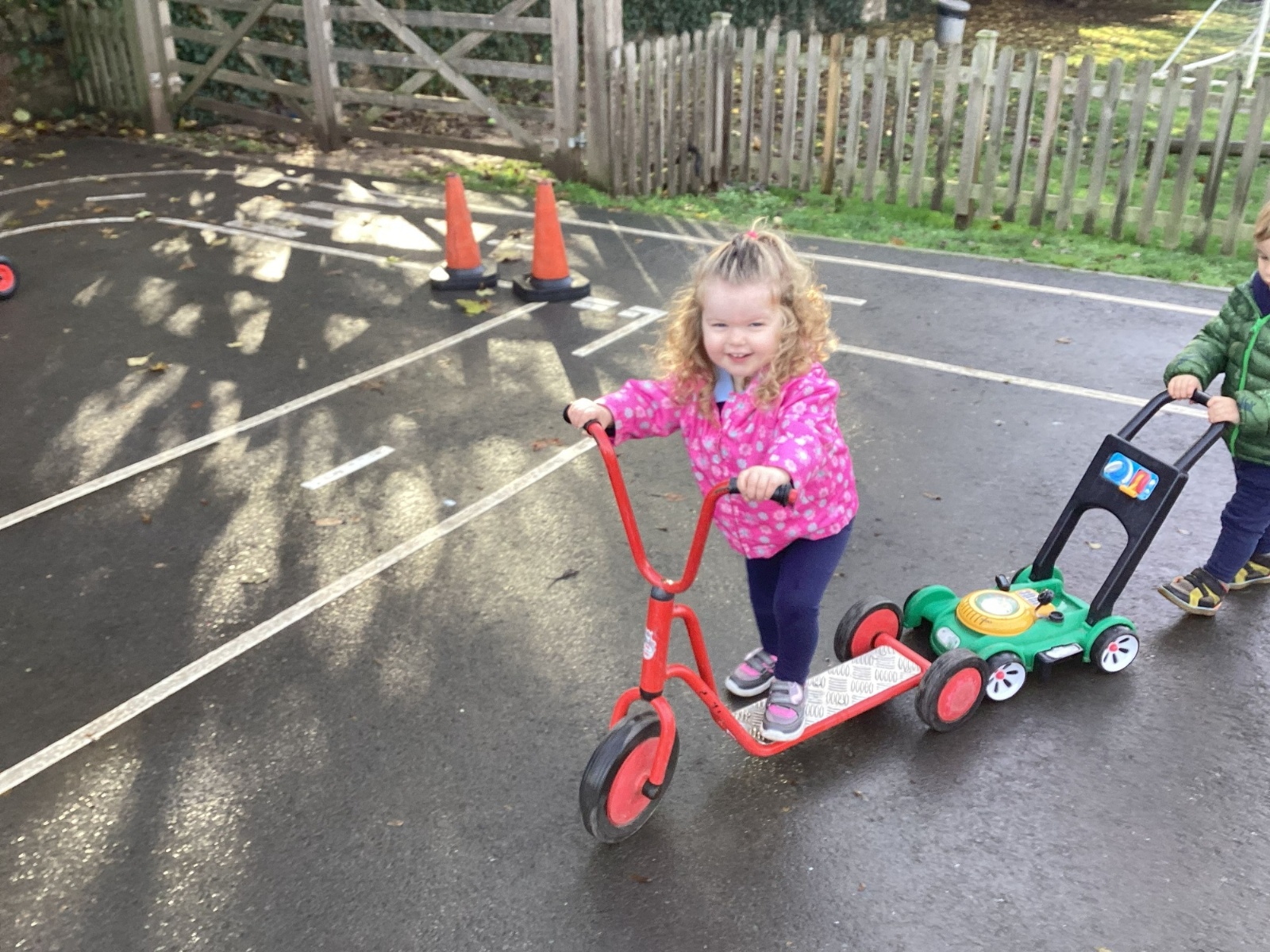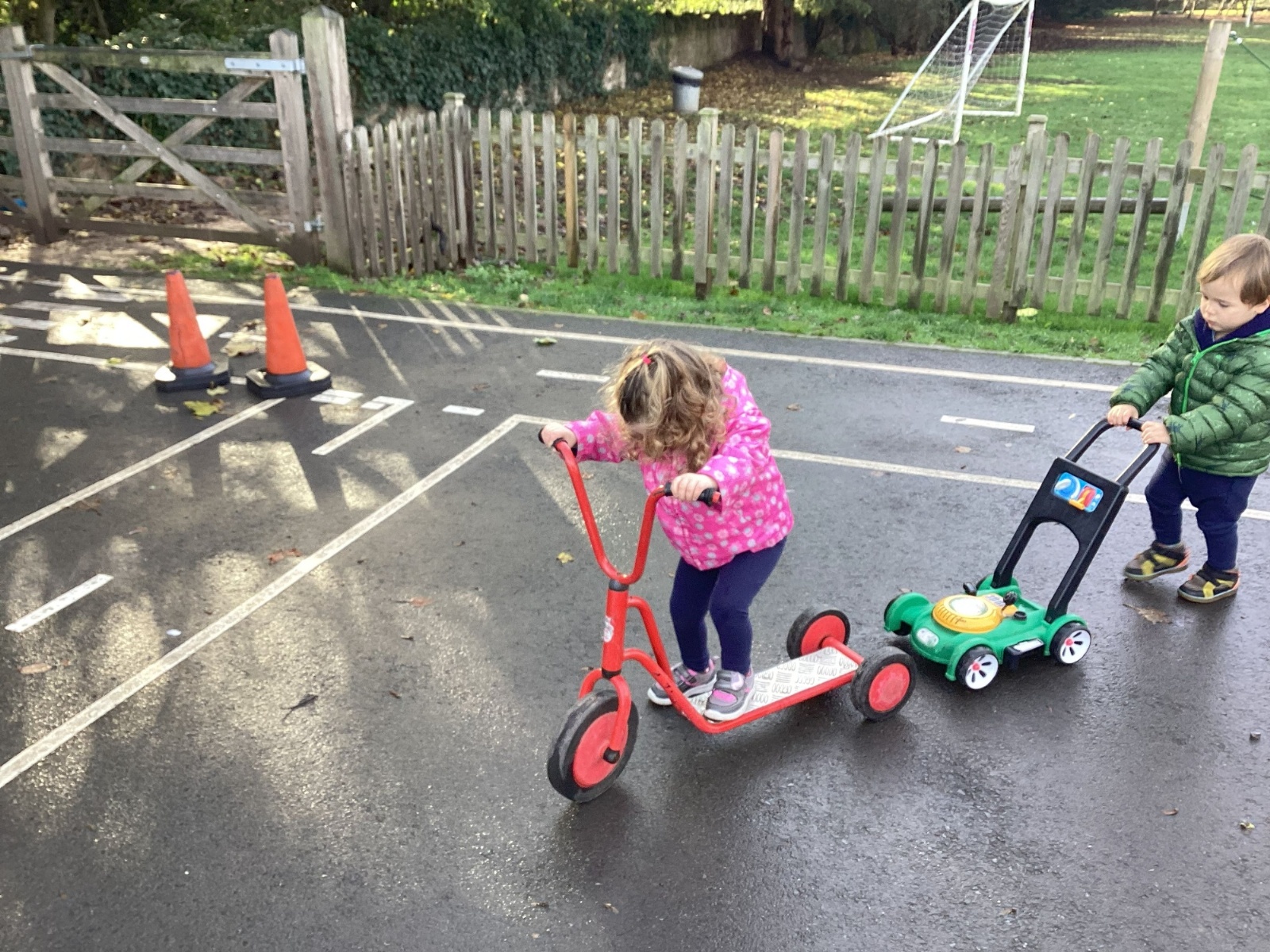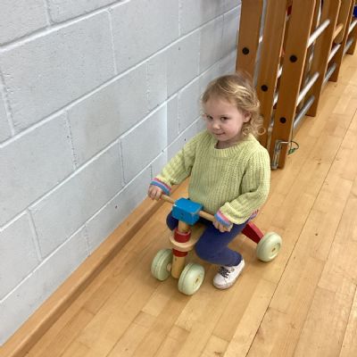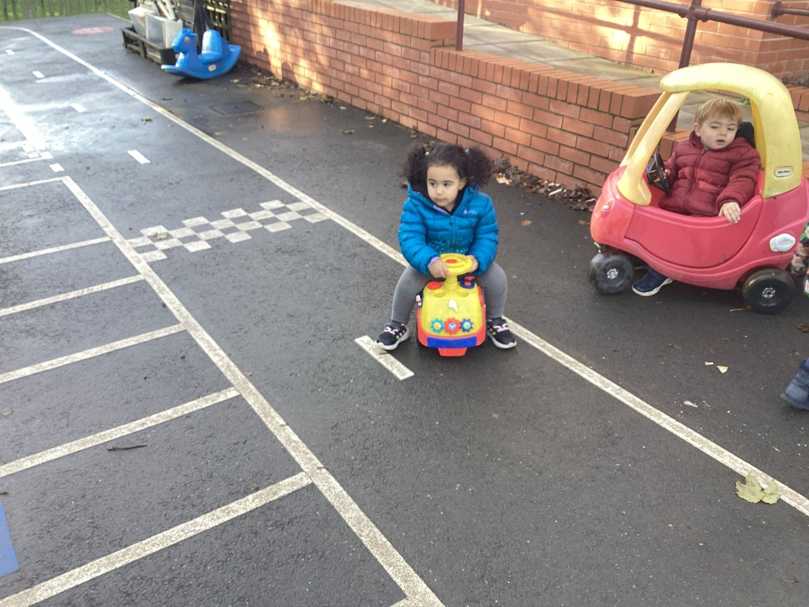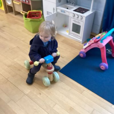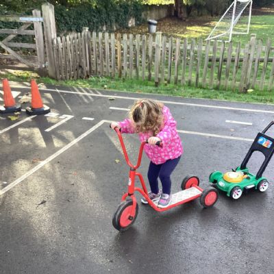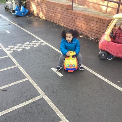 The children really enjoy riding the push-along cars, balance bikes and scooters around the track on the playground.