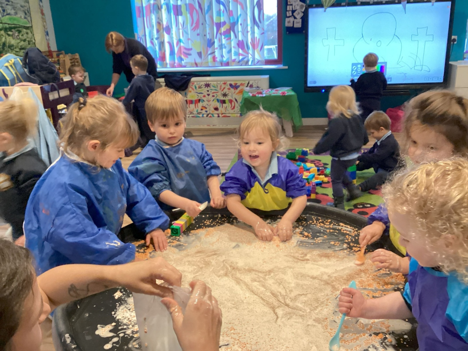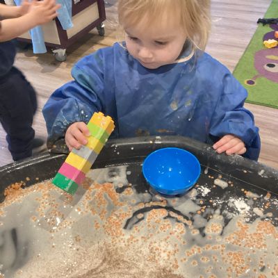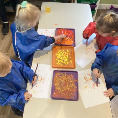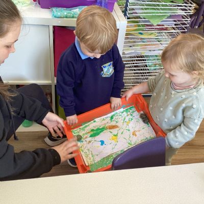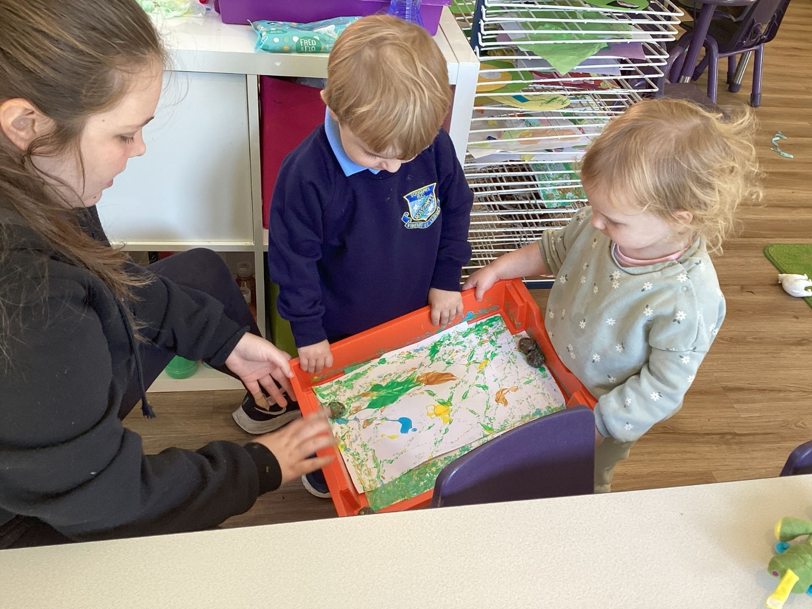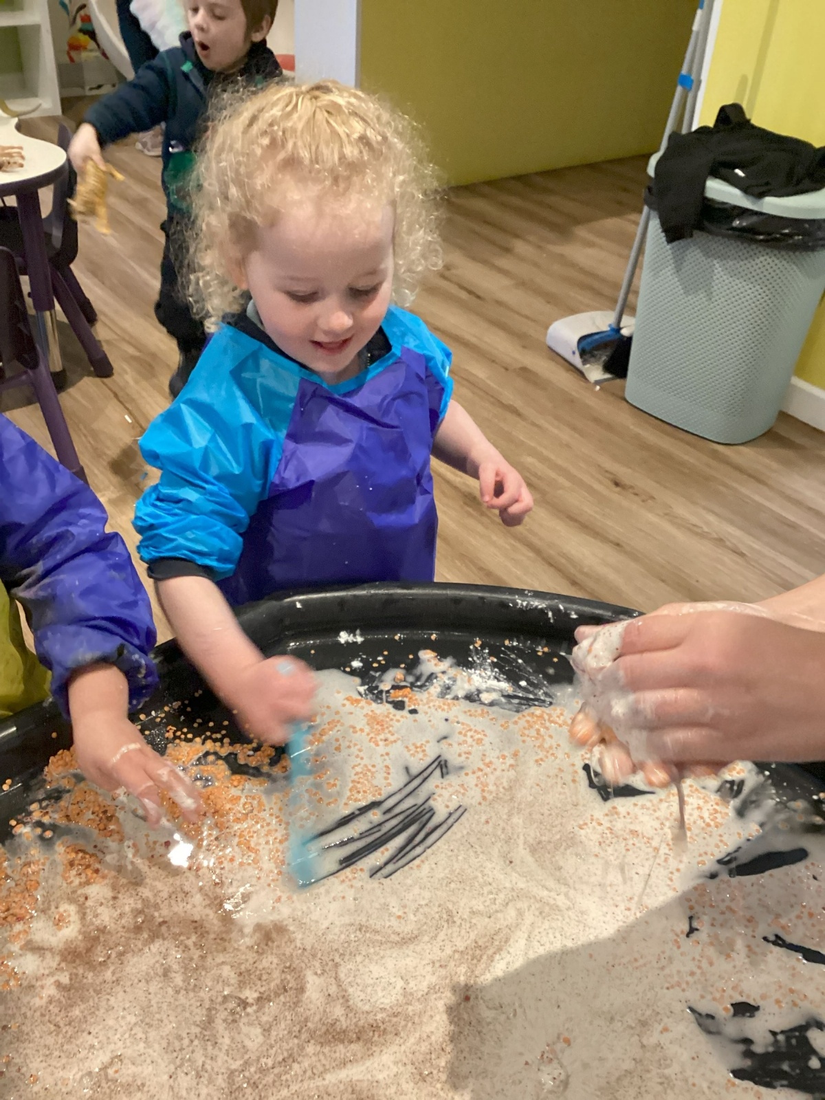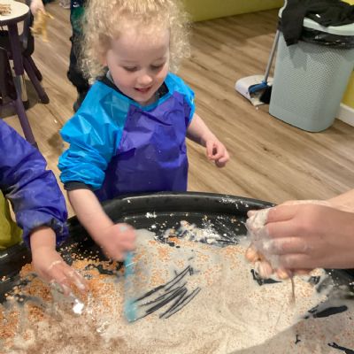 We also promote literacy by mark making. The children mark make in lots of different ways such as in messy play with shaving foam, sand or gloop - enjoying the sensory experience of making marks. The children also use pencils and crayons on paper and colouring sheets.
