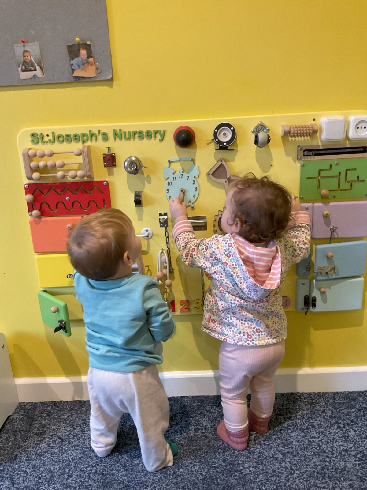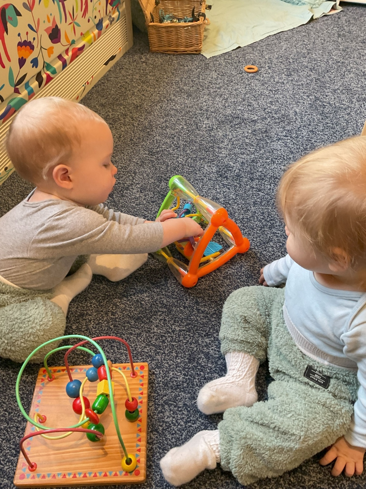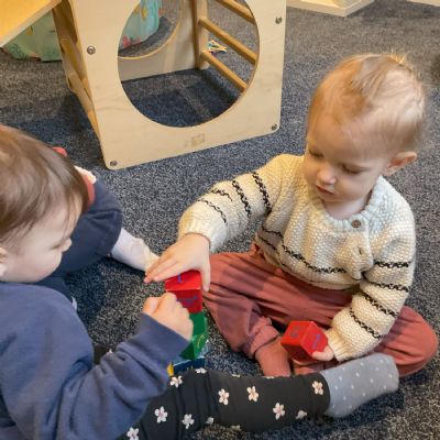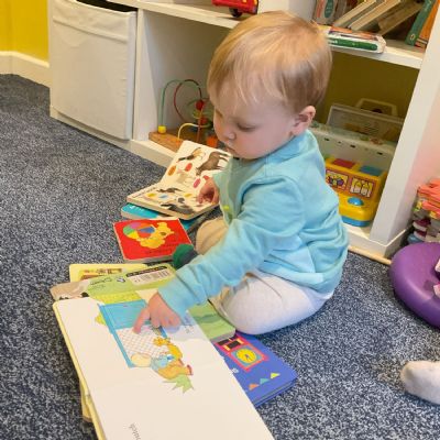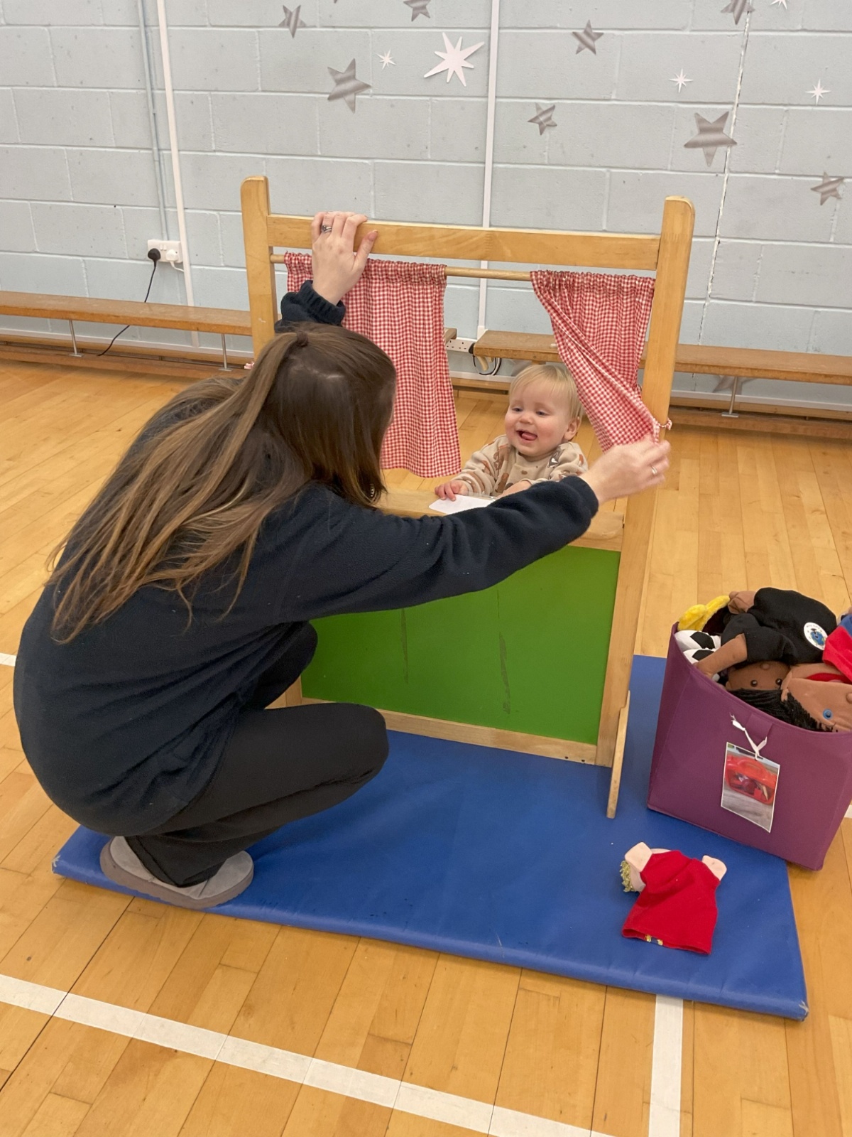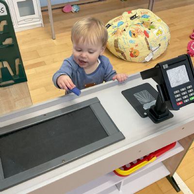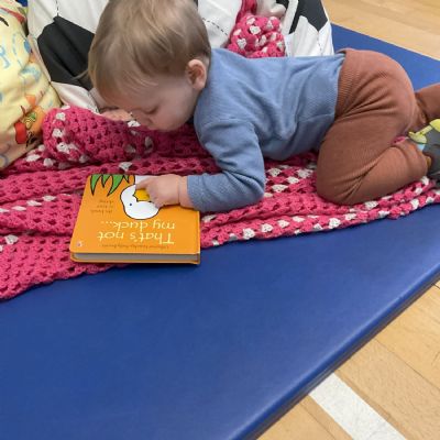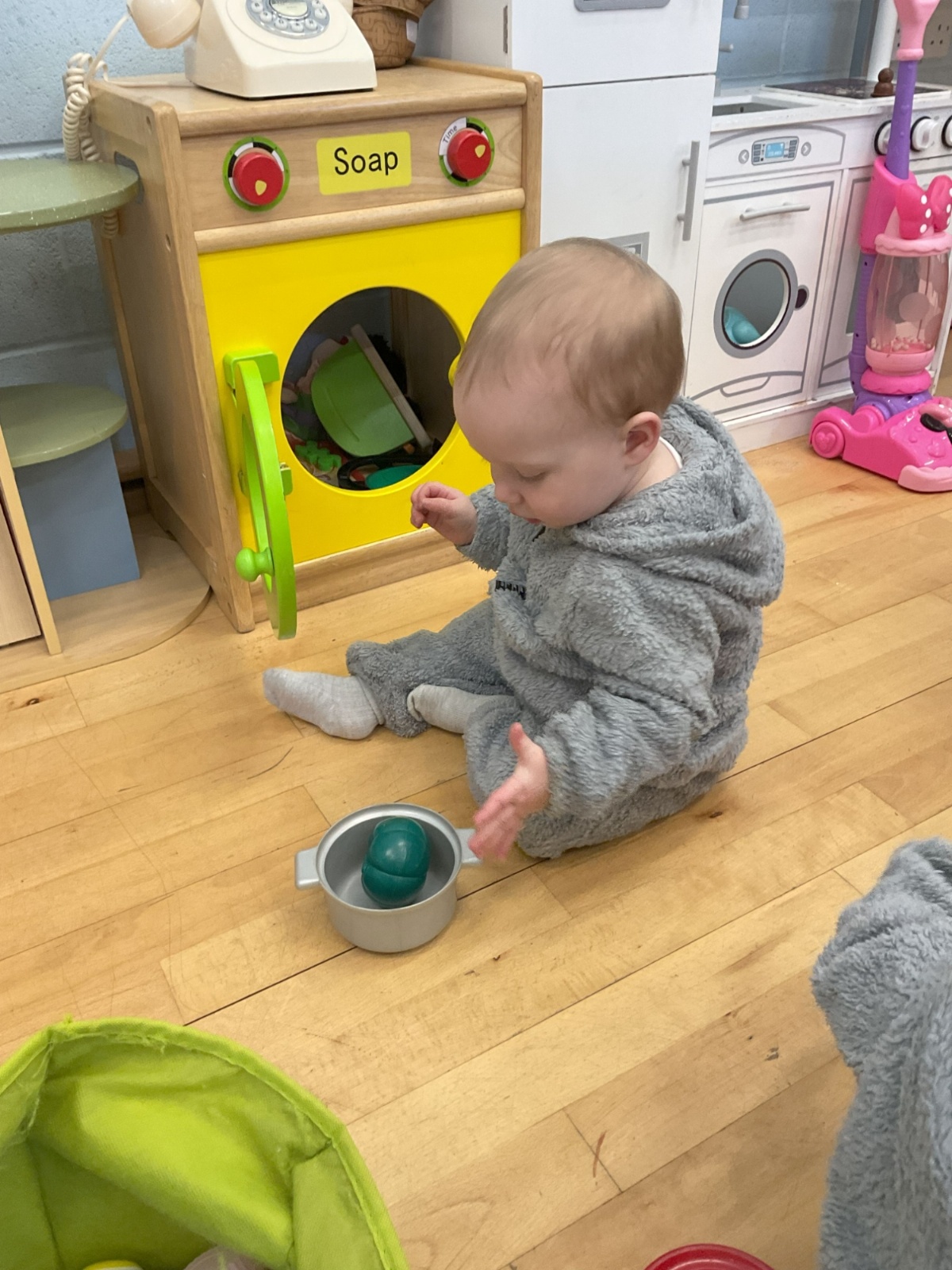 Role-play is a great opportunity for communication and language. When the children are playing in the role-play areas, they use single words such as 'baba' for baby. They also engage in pretend play by bringing the cup to their mouth, feeding the babies bottles and cooking in the kitchen.