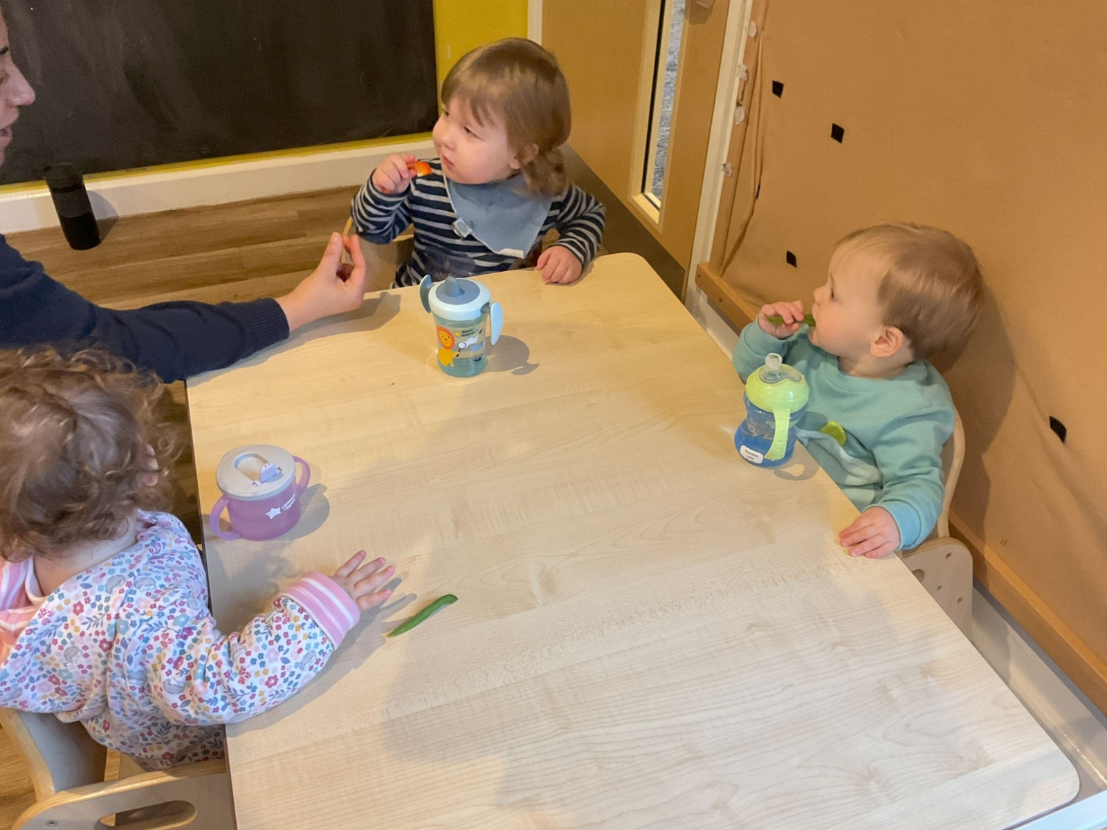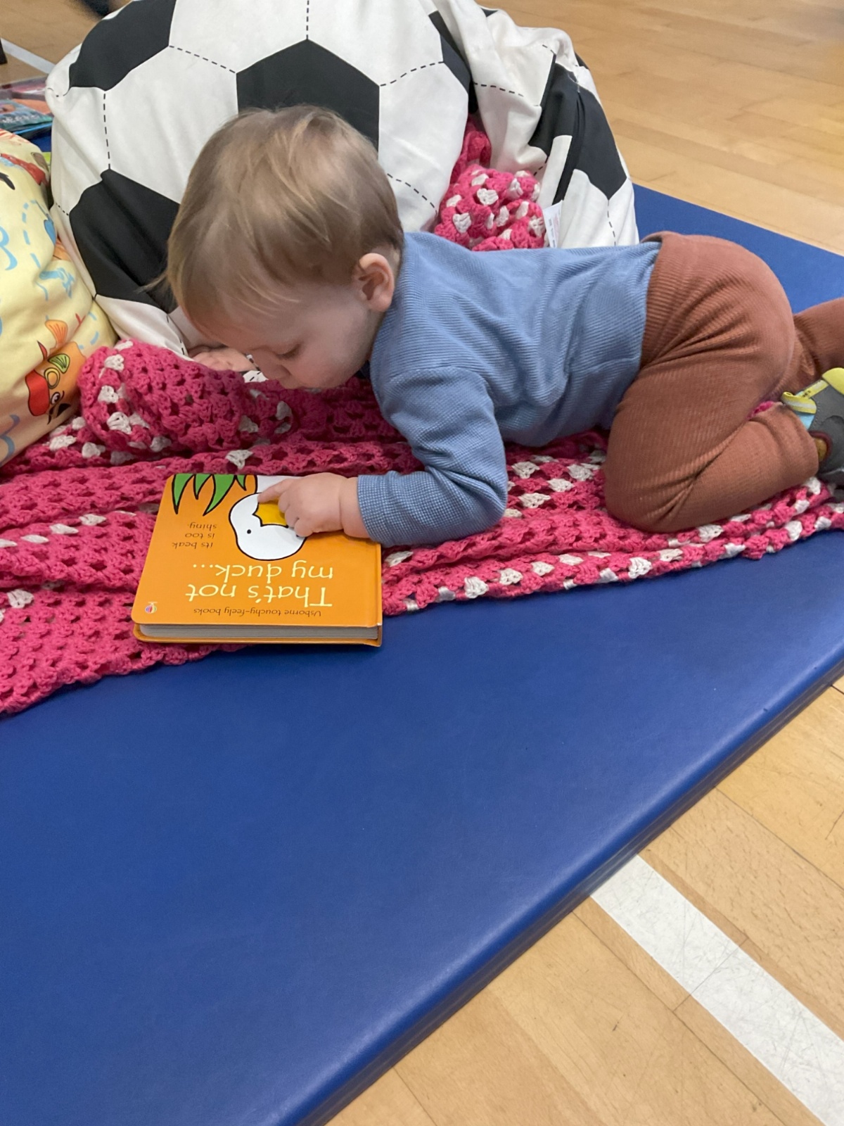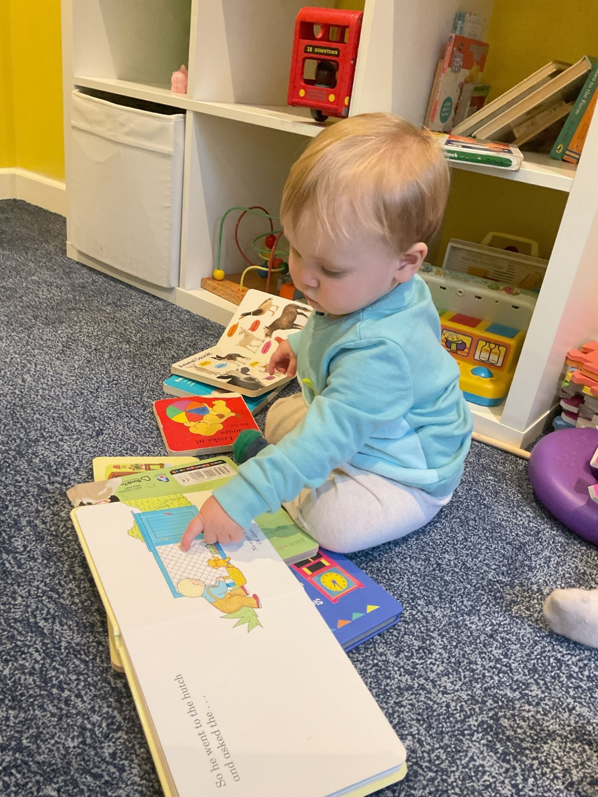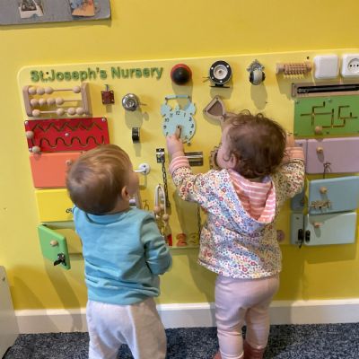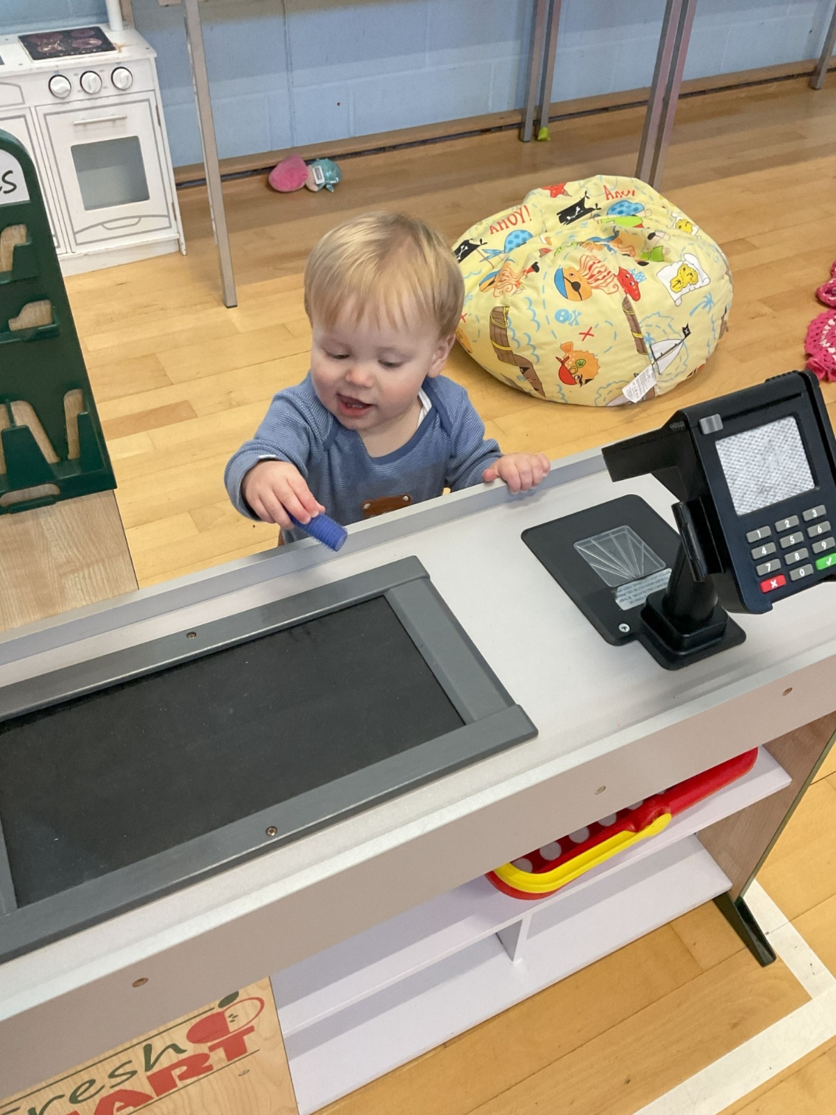 Role-play is a great opportunity for communication and language. When the children are playing in the role-play areas, they use single words such as 'baba' for baby. They also engage in pretend play by bringing the cup to their mouth, feeding the babies bottles and cooking in the kitchen.